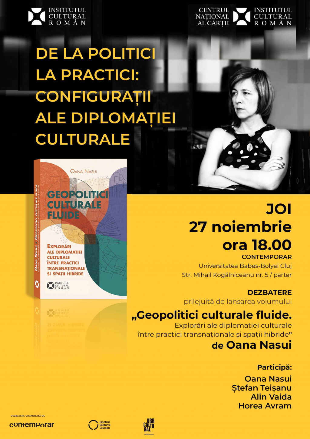 Joi, 27 noiembrie, la ora 18. 00, la Spațiul CONTEMPORAR din Cluj-Napoca va avea loc dezbaterea „De la politici la practici: configurații ale diplomației culturale, cu Oana Nasui (manager și cercetător cultural), Ștefan Teișanu (Centrul Cultural Clujean), Alin Vaida (Jazz in the Park) și conf. univ. dr. Horea Avram...