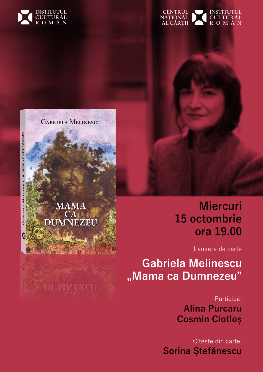 Miercuri, 15 octombrie, la ora 19. 00, la Sala Mare a Institutului Cultural Român (Aleea Alexandru nr. 38) va avea loc lansarea unei cărți-eveniment: prima traducere în limba română a romanului „Mama ca Dumnezeu de Gabriela Melinescu. Publicat în premieră la Editura ICR cu sprijinul ICR Stockholm și lansat în ziua...